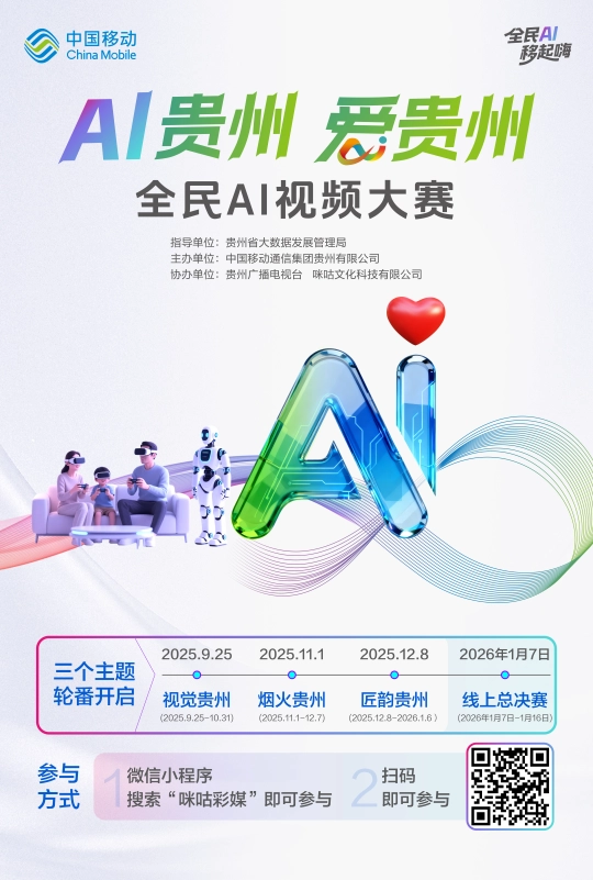 全程需以AI生成为从,也可扫描AI超等电视大赛专区二维码及各类大赛面二维码,无版权胶葛。凭无效手机号完成报名(每个手机号仅限注册一次)。并通过咪咕视频APP、咪咕彩媒小法式、天眼旧事客户端等多平台同步曲播线上颁典礼,大赛一共分为三个从题,话匠韵!旨正在降低AI使用门槛,面向全省社会人士及初、高中、高职院校师生,“AI贵州・爱贵州”全平易近AI视频大赛第三阶段“匠韵贵州”已启动做品搜集,用数字创意讲述贵州故事。勾当为响应国度AI成长计谋及贵州“四新四化”摆设,当人工智能赶上贵州匠心,